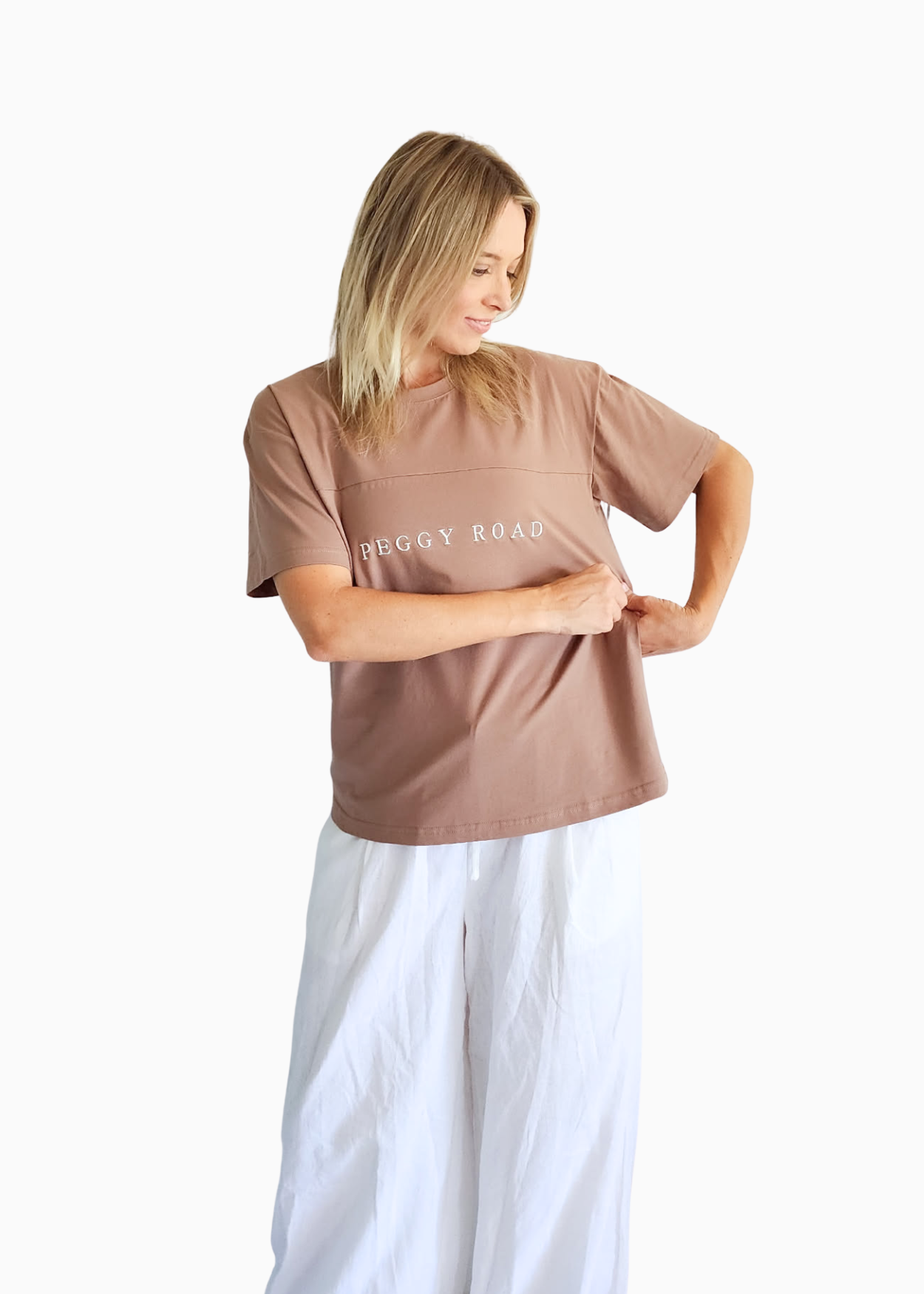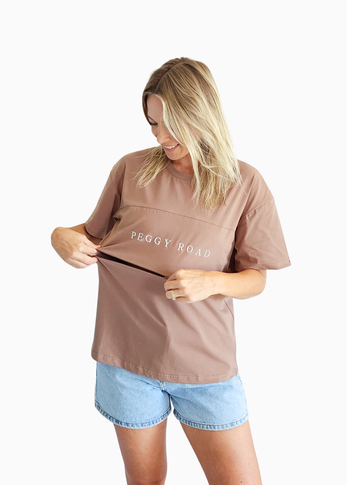 Feel comfortable, while looking casually stylish and feed your little one with ease in our Latte Signature Breastfeeding T-Shirt.
